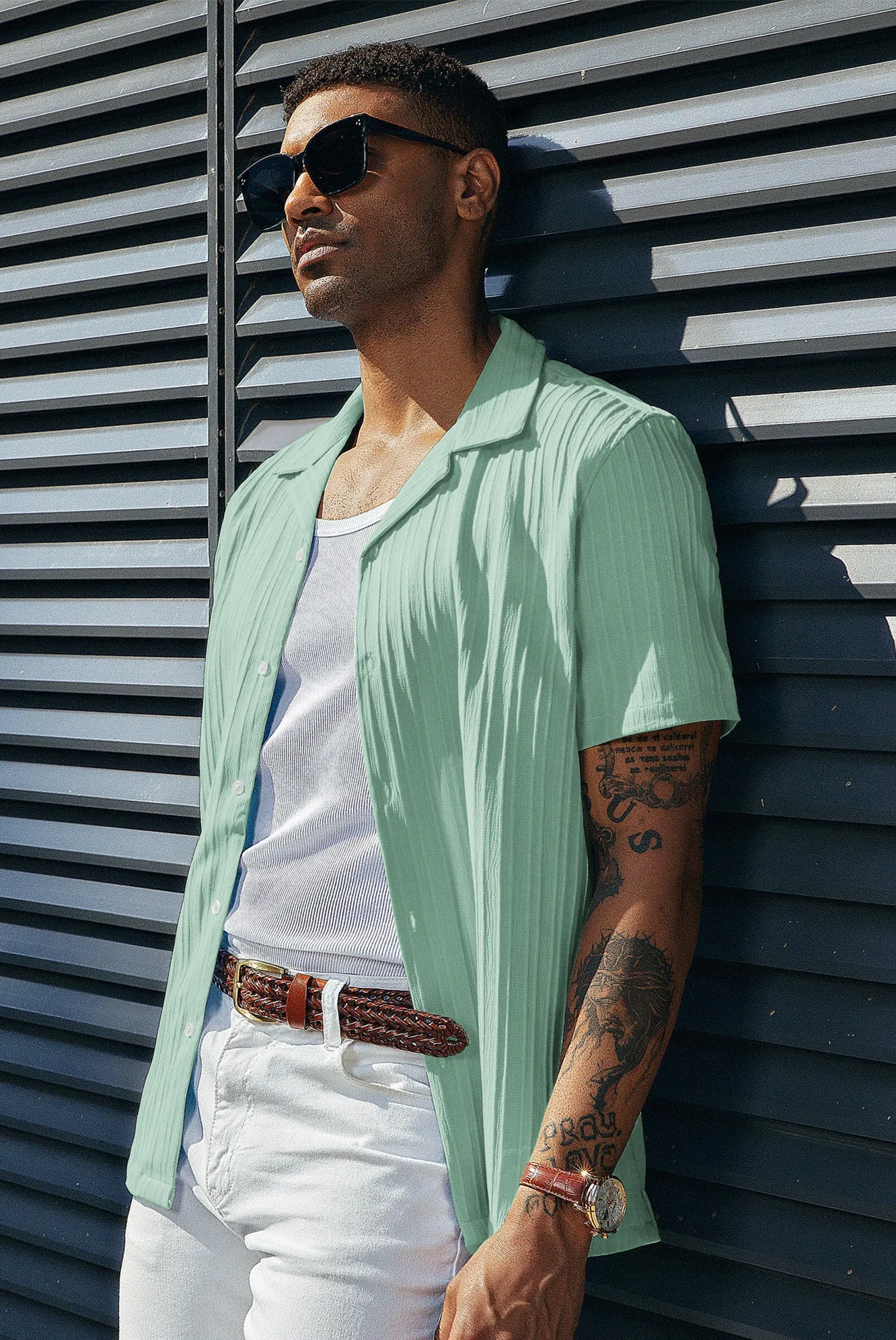 - 【Fashion Design】:This men's casual short sleeve shirt is the ideal top for summer. It embraces a sense of style and attention to detail. With its classic solid color and exquisite vertical stripes, it exudes a fashion-forward and minimalist vibe. The shirt features a Cuban collar, button down, and a well-proportioned and structured fit. Whether you're hitting the beach or enjoying leisure time, this shirt will bring out your unique charm.